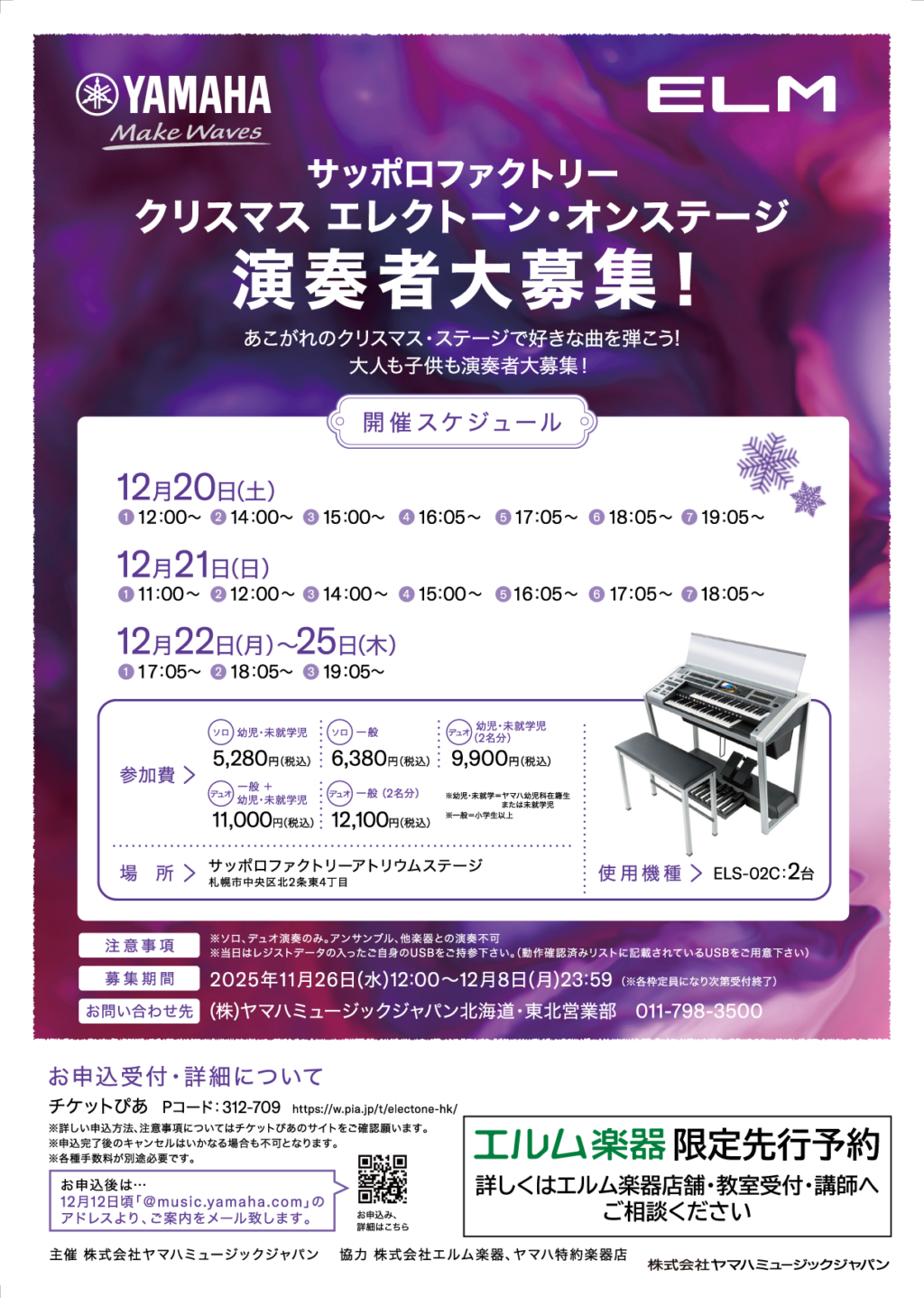 2025年12月 全店 イベント・コンサート サッポロファクトリー クリスマス エレクトーンオンステージ 演奏者大募集!! 日時 2025年12月 会場 サッポロファクトリーアトリウム特設ステージ お問い合わせ エルム楽器(本社011-350-1111) ★お申込みはチケットぴあからお申込みください。 ★先行予約の詳細はエルム楽器各店舗・教室にて 備考 NEWS CATEGORYお知らせカテゴリー イベント・コンサートセール・フェアその他 SHOP CATEGORY店舗カテゴリー 全店千歳札幌室蘭釧路苫小牧 NEW POSTS新着記事 札幌 その他 イオン手稲駅前センター 10/31 グランドオープン! 2026年3月31日(火)まで 全店 セール・フェア ヤマハ電子ピアノ クラビノーバCLPシリーズ エルム楽器音楽教室生応援キャンペーン 2025年11月1日~12月26日(金)まで 全店 イベント・コンサートセール・フェア Premium Piano Fair 全店 セール・フェア 中古ピアノ在庫一覧表 随時更新中 2025年12月 全店 イベント・コンサート サッポロファクトリー クリスマス エレクトーンオンステージ 演奏者大募集!! 11月8日(土)・9日(日) 11月22日(土)~24日(月祝) 札幌 セール・フェア ヤマハ 防音体験・相談会 2025.11.22(土)11:30予定(時間は変動の可能性がございます) 【観覧無料】 札幌 イベント・コンサート 《YUTA & Nue》ビートボックス ロビーライブ! 2025年11月1日(土)~12月14日(日) 全店 セール・フェア クリスマスフェア2025 開催中! 11/4・11/25 札幌 その他 札幌本店店舗 臨時休業のお知らせ