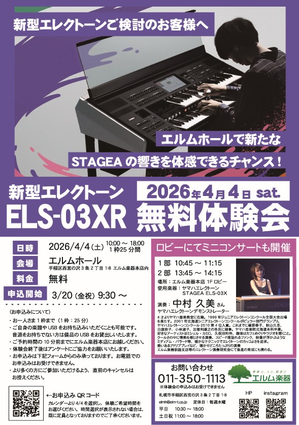 エルム楽器本店で、25分間弾き放題の新型エレクトーンELS-03XR体験会を開催いたします。