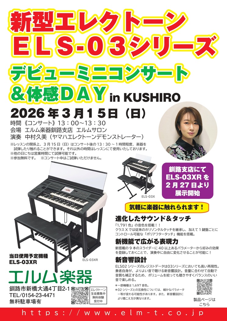 3/15(日)新型エレクトーン ELS-03シリーズ デビューミニコンサート&体感DAY in KUSHIRO