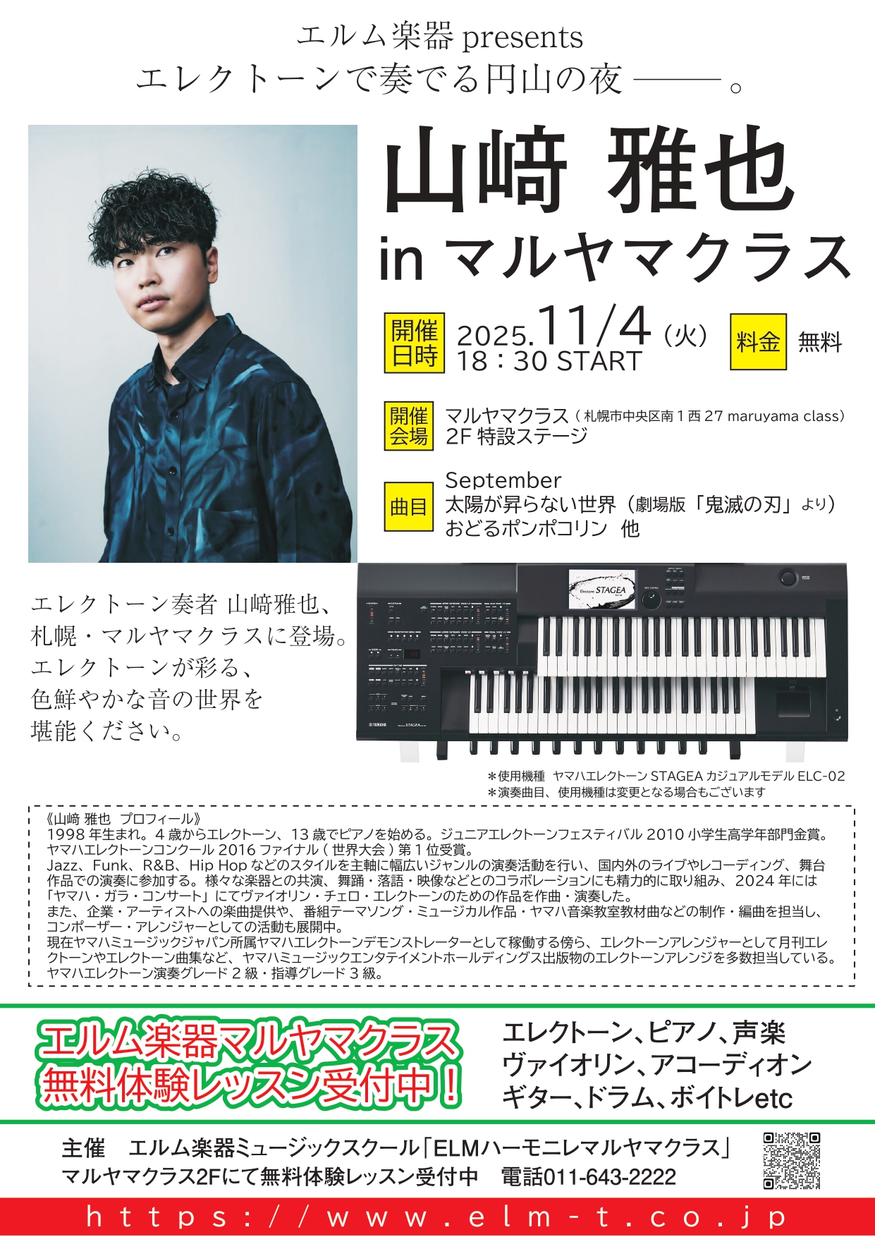 2025年11月3日(祝月) 第一部open13:00 start13:20 第二部start17:20 ※チケットは各部共通、入り自由です 全店千歳札幌室蘭苫小牧釧路イベント・コンサート ELM Electone Special Live2025 in PennyLane24