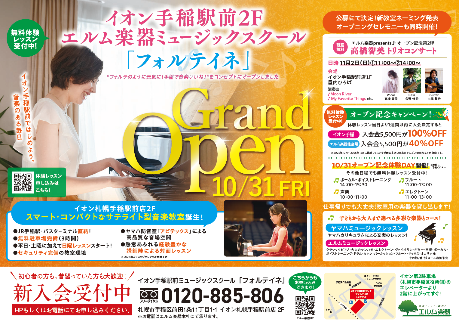札幌その他 イオン手稲駅前センター 10/31 グランドオープン! 2025年11月3日(祝月) 第一部open13:00 start13:20 第二部start17:20 ※チケットは各部共通、入り自由です 全店イベント・コンサート ELM Electone Special Live2025 in PennyLane24 2026年3月31日(火)まで 全店セール・フェア ヤマハ電子ピアノ クラビノーバCLPシリーズ エルム楽器音楽教室生応援キャンペーン 2025年11月1日~12月26日(金)まで 全店イベント・コンサートセール・フェア Premium Piano Fair 10/31(金)まで 札幌セール・フェア エルム楽器 弦楽器Special Sale 全店セール・フェア 中古ピアノ在庫一覧表 随時更新中 2025年10月25日(土) 札幌イベント・コンサート ハロウィンストリートコンサート開催決定! 10月11日(土)~13日(月祝) 10月25日(土)・26日(日) 札幌セール・フェア ヤマハ 防音体験・相談会 2025.10/28(火)11:00-12:00 札幌イベント・コンサート 札幌本社センター《美声のための♪ヴォイトレ&ストレッチトレーニング!》 札幌その他 1冊でわかるポケット教養シリーズキャンペーン 釧路その他 釧路支店 10月店舗休業日のお知らせ 札幌その他 CASIO AIペットMoflinお取り扱い開始しました! 2025年9月28日(日) 千歳その他 ブルグミュラーコンクール千歳地区褒章について 苫小牧その他 苫小牧支店10月の店舗休業日のお知らせ 2025年9月1日(月)~10月31日(金) 全店その他 楽譜を買って景品を当てよう! 秋のレシート応募キャンペーン実施中!! 2025年10月31日(金)まで 札幌セール・フェア ハッピーハロウィンフェア開催! 1234> NEWS CATEGORYお知らせカテゴリー イベント・コンサートセール・フェアその他 SHOP CATEGORY店舗カテゴリー 全店千歳札幌室蘭釧路苫小牧 NEW POSTS新着記事 札幌 その他 イオン手稲駅前センター 10/31 グランドオープン! 2025年11月3日(祝月) 第一部open13:00 start13:20 第二部start17:20 ※チケットは各部共通、入り自由です 全店 イベント・コンサート ELM Electone Special Live2025 in PennyLane24 2026年3月31日(火)まで 全店 セール・フェア ヤマハ電子ピアノ クラビノーバCLPシリーズ エルム楽器音楽教室生応援キャンペーン 2025年11月1日~12月26日(金)まで 全店 イベント・コンサートセール・フェア Premium Piano Fair 10/31(金)まで 札幌 セール・フェア エルム楽器 弦楽器Special Sale 全店 セール・フェア 中古ピアノ在庫一覧表 随時更新中 2025年10月25日(土) 札幌 イベント・コンサート ハロウィンストリートコンサート開催決定! 10月11日(土)~13日(月祝) 10月25日(土)・26日(日) 札幌 セール・フェア ヤマハ 防音体験・相談会 2025.10/28(火)11:00-12:00 札幌 イベント・コンサート 札幌本社センター《美声のための♪ヴォイトレ&ストレッチトレーニング!》 札幌 その他 1冊でわかるポケット教養シリーズキャンペーン 釧路 その他 釧路支店 10月店舗休業日のお知らせ
