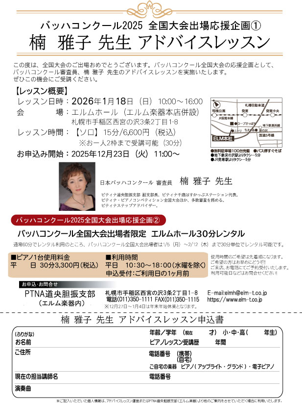 バッハコンクール全国大会応援企画として、バッハコンクール審査員である楠雅子先生のアドバイスレッスンを実施いたします。