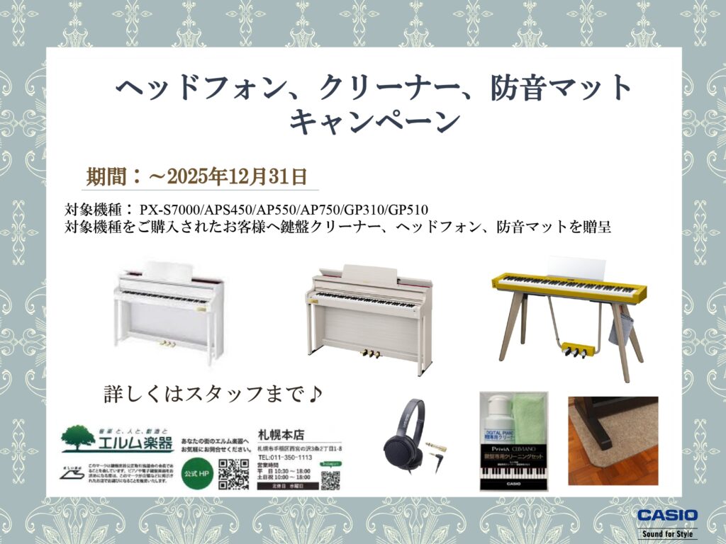 ~12月26日(金) 全店 セール・フェア CASIOコラボキャンペーン ~2025年12月末までに対象機種をご購入された先着3名様限定で鍵盤クリーナー、ヘッドフォン、防音マットをプレゼント!詳しくはスタッフまでお問い合せください! 対象機種はこちら↓PX-S7000/AP-S450/AP-550/AP-750/GP-510 日時 ~12月26日(金) 会場 エルム楽器全支店 お問い合わせ 電話番号:011-350-1113 メールアドレス:elmh@elm-t.co.jp 備考 -- NEWS CATEGORYお知らせカテゴリー イベント・コンサートセール・フェアその他 SHOP CATEGORY店舗カテゴリー 全店千歳札幌室蘭釧路苫小牧 NEW POSTS新着記事 札幌 その他 イオン手稲駅前センター 10/31 グランドオープン! 2026年3月31日(火)まで 全店 セール・フェア ヤマハ電子ピアノ クラビノーバCLPシリーズ エルム楽器音楽教室生応援キャンペーン 2025年11月1日~12月26日(金)まで 全店 イベント・コンサートセール・フェア Premium Piano Fair 全店 セール・フェア 中古ピアノ在庫一覧表 随時更新中 2025年11月1日(土)~2026年2月28日(土) 札幌 セール・フェア アビテックス Web見積りキャンペーン 2025年12月26日(金)まで 全店 セール・フェア -ヤマハ防音室- アビテックスフェア 2025年11月15日(土)~12月23日(火) 札幌 セール・フェア グランドピアノ選定会 2025年11月24日(月祝)、11月30日(日)、12月7日(日) 札幌 セール・フェア 中古ピアノ大抽選会in札幌本店! ~12月26日(金) 全店 セール・フェア CASIOコラボキャンペーン