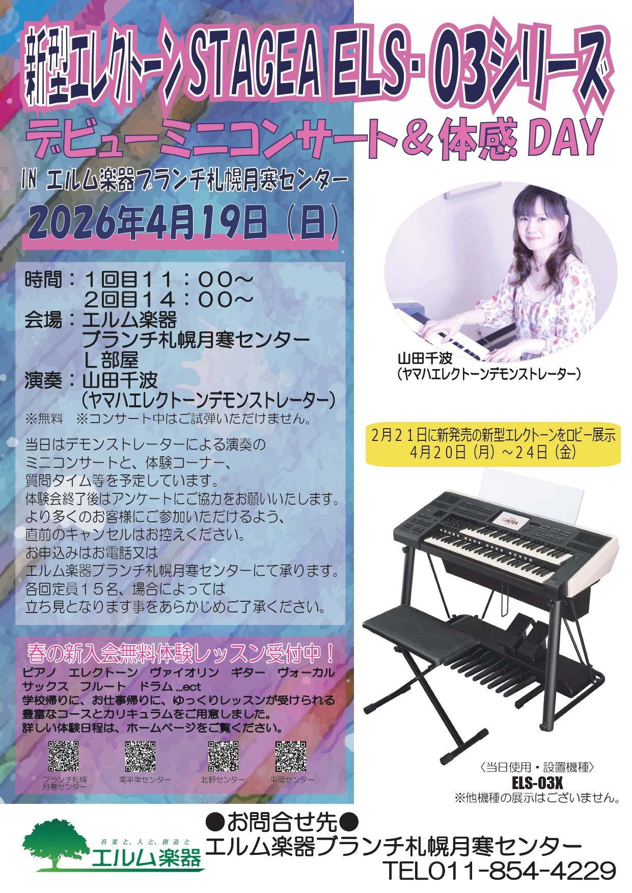 エルム楽器ブランチ札幌月寒センターにて、新型エレクトーンELS-03Xを使用したミニコンサートを開催いたします。