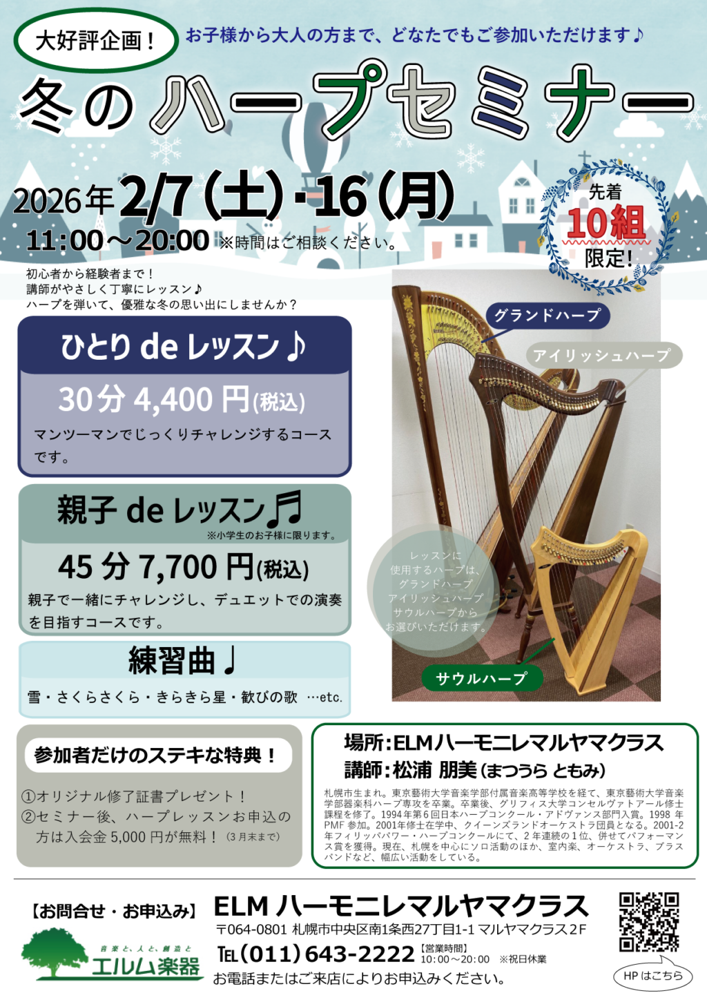 ELMハーモニレマルヤマクラスにて、大好評企画のハープセミナーをこの冬も開催いたします!