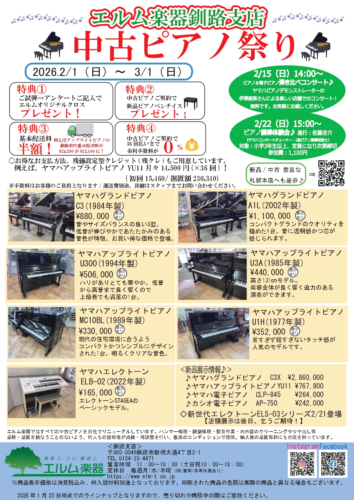 2026.2/1(日)~3/1(日) ♪中古ピアノ祭り期間中の釧路店営業日: 2/6(金)7(土)8(日)10(火)11(水祝)13(金)14(土) 15(日)17(火)20(金)21(土)22(日)23(月祝)27(金) 28(土)3/1(日) 釧路セール・フェア ~3/1(日)釧路支店《中古ピアノ祭り》 2026年1月1日(木)~ 全店セール・フェア 新espressivo発売記念 『プレミアムボックス』プレゼントキャンペーン 全店セール・フェア 【レッスン在籍生徒様限定】ヤマハピアノご購入サポートプラン 2026年3月31日(火)まで 全店セール・フェア CASIO電子ピアノ購入キャンペーン 2025年11月1日(土)~2026年2月28日(土) 札幌セール・フェア アビテックス Web見積りキャンペーン 2026/2/28まで 全店セール・フェア ピアノ調律キャンペーン 2026年1月10日(土)~3月8日(日) 札幌セール・フェア ヘンレ版フェア開催中! 2026年3月31日(火)まで 全店セール・フェア ヤマハ電子ピアノ クラビノーバCLPシリーズ エルム楽器音楽教室生応援キャンペーン 〜2026年3月31日(火)まで 全店セール・フェア 【延長決定!】カシオ CELVIANO スタートアップキャンペーン実施中! 全店セール・フェア 中古ピアノ在庫一覧表 随時更新中 1 NEWS CATEGORYお知らせカテゴリー イベント・コンサートセール・フェアその他 SHOP CATEGORY店舗カテゴリー 全店札幌釧路 NEW POSTS新着記事 全店 その他 ヤマハのグループレッスン 2026春の体験・入会受付中! 2026年2月21日(土)発売予定 全店 その他 ヤマハエレクトーンSTAGEA『ELS-03シリーズ』発売のお知らせ 2026年3月5日(木)発売 全店 その他 ヤマハグランドピアノ『C3X espressivo』『C2X espressivo』発売のお知らせ 2026年3月31日(火)まで 全店 セール・フェア ヤマハ電子ピアノ クラビノーバCLPシリーズ エルム楽器音楽教室生応援キャンペーン 〜2026年3月31日(火)まで 全店 セール・フェア 【延長決定!】カシオ CELVIANO スタートアップキャンペーン実施中! 全店 セール・フェア 中古ピアノ在庫一覧表 随時更新中 2026.2/15(日)14:00~ 観覧無料/予約不要 ※立ち見の際はご容赦下さい 釧路 イベント・コンサート 2/15(日)14:00釧路支店〈ピアノ&電子ピアノ弾き比べコンサート♪〉 2026.2/1(日)~3/1(日) ♪中古ピアノ祭り期間中の釧路店営業日: 2/6(金)7(土)8(日)10(火)11(水祝)13(金)14(土) 15(日)17(火)20(金)21(土)22(日)23(月祝)27(金) 28(土)3/1(日) 釧路 セール・フェア ~3/1(日)釧路支店《中古ピアノ祭り》 2026/2/22 開場12:15 開演12:30 札幌 イベント・コンサート 第6回 2025年度コンクール入賞者による受賞者コンサート 2026年1月1日(木)~ 全店 セール・フェア 新espressivo発売記念 『プレミアムボックス』プレゼントキャンペーン 全店 セール・フェア 【レッスン在籍生徒様限定】ヤマハピアノご購入サポートプラン