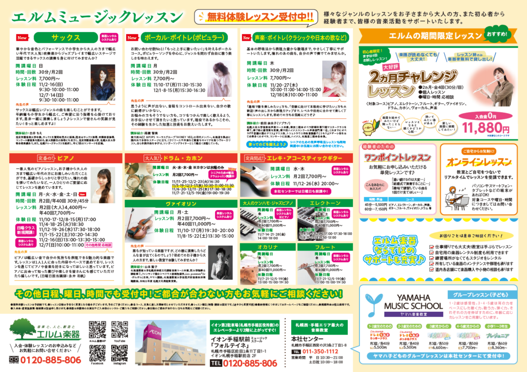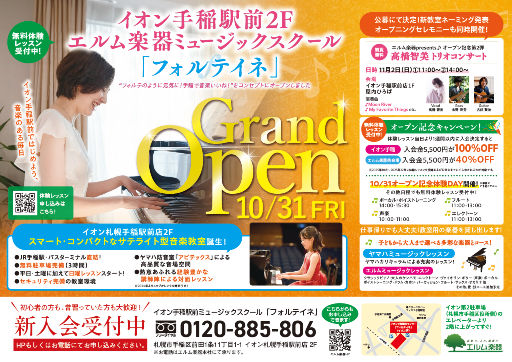 札幌 その他 イオン手稲駅前センター 10/31 グランドオープン! イオン札幌 手稲駅前店に、エルム楽器の音楽教室がオープンします! JR手稲駅・バスターミナル直結、無料駐車場完備。平日・土曜はもちろん、日曜レッスンもスタート! オープン記念で入会金100%OFFキャンペーンも実施中!只今各種レッスンの無料体験レッスンの受付を行っております。 開講レッスンなど詳しくはチラシをご覧ください。 無料体験レッスンのお申込みはこちら