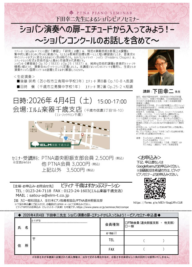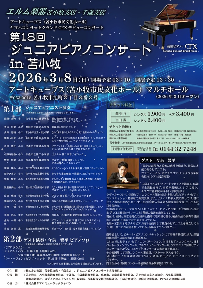 2026年3月8日(日)13:10開場 13:30開演 千歳苫小牧イベント・コンサート 18th ジュニアピアノコンサートin苫小牧 2026年 4月4日(土)15時~17時程度エルム楽器千歳支店 千歳イベント・コンサート ショパン演奏への扉、エチュードから入ってみよう!~ショパンコンクールのお話しを含めて~ 2026年3月1日(日)15:00~(苫小牧支店) 2026年3月7日(土)15:00~(千歳支店) 千歳苫小牧イベント・コンサート 新型エレクトーン ELS-03シリーズ デビューミニコンサート&体感DAY(千歳・苫小牧) 1 NEWS CATEGORYお知らせカテゴリー イベント・コンサートセール・フェアその他 SHOP CATEGORY店舗カテゴリー 全店千歳札幌釧路苫小牧 NEW POSTS新着記事 全店 その他 ヤマハのグループレッスン 2026春の体験・入会受付中! 2026年2月21日(土)発売予定 全店 その他 ヤマハエレクトーンSTAGEA『ELS-03シリーズ』発売のお知らせ 2026年3月5日(木)発売 全店 その他 ヤマハグランドピアノ『C3X espressivo』『C2X espressivo』発売のお知らせ 2026年3月31日(火)まで 全店 セール・フェア ヤマハ電子ピアノ クラビノーバCLPシリーズ エルム楽器音楽教室生応援キャンペーン 〜2026年3月31日(火)まで 全店 セール・フェア 【延長決定!】カシオ CELVIANO スタートアップキャンペーン実施中! 全店 セール・フェア 中古ピアノ在庫一覧表 随時更新中 札幌 その他 札幌本店臨時休業のお知らせ 2026年6月12日(金)17:30開場 18:00開演 札幌 その他 【プレイガイド】ピアノデュオ ドゥオールコンサート 2026年3月8日(日)13:10開場 13:30開演 千歳苫小牧 イベント・コンサート 18th ジュニアピアノコンサートin苫小牧 2026年5月23日(土)12:30開場 13:00開演 札幌 その他 【プレイガイド】早坂忠明ふるさとピアノリサイタル 2026年 4月4日(土)15時~17時程度エルム楽器千歳支店 千歳 イベント・コンサート ショパン演奏への扉、エチュードから入ってみよう!~ショパンコンクールのお話しを含めて~