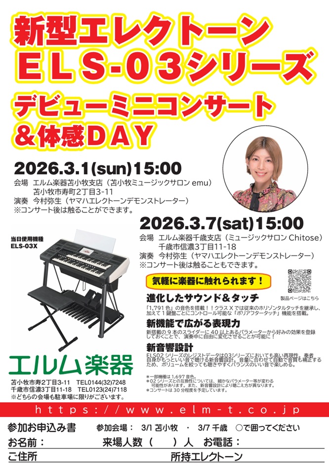 2026年3月1日(日)15:00~(苫小牧支店) 2026年3月7日(土)15:00~(千歳支店) 千歳苫小牧イベント・コンサート 新型エレクトーン ELS-03シリーズ デビューミニコンサート&体感DAY(千歳・苫小牧)
