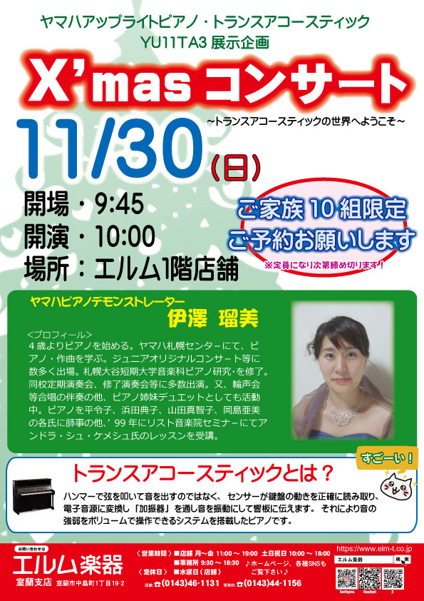 - ヤマハデモンストレーター伊澤瑠美氏によるヤマハトランスアコースティックアップライトピアノYU11TA3でのクリスマスコンサート。
